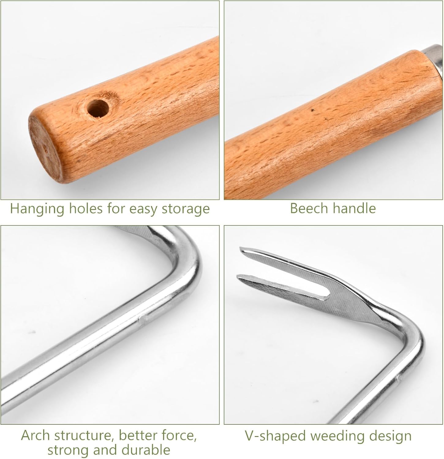 El mango de madera de haya resistente y ecológico proporciona un agarre cómodo y seguro, lo que te permitirá trabajar en el jardín durante horas sin lastimar tus manos o muñecas. La ergonomía de este arrancador de malezas te brinda la comodidad que necesitas para realizar tus tareas de jardinería de forma eficiente.